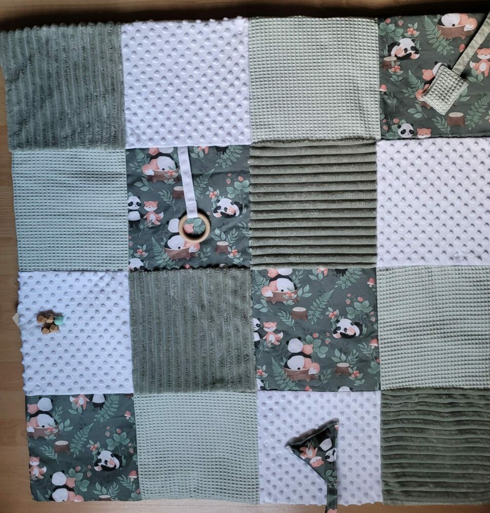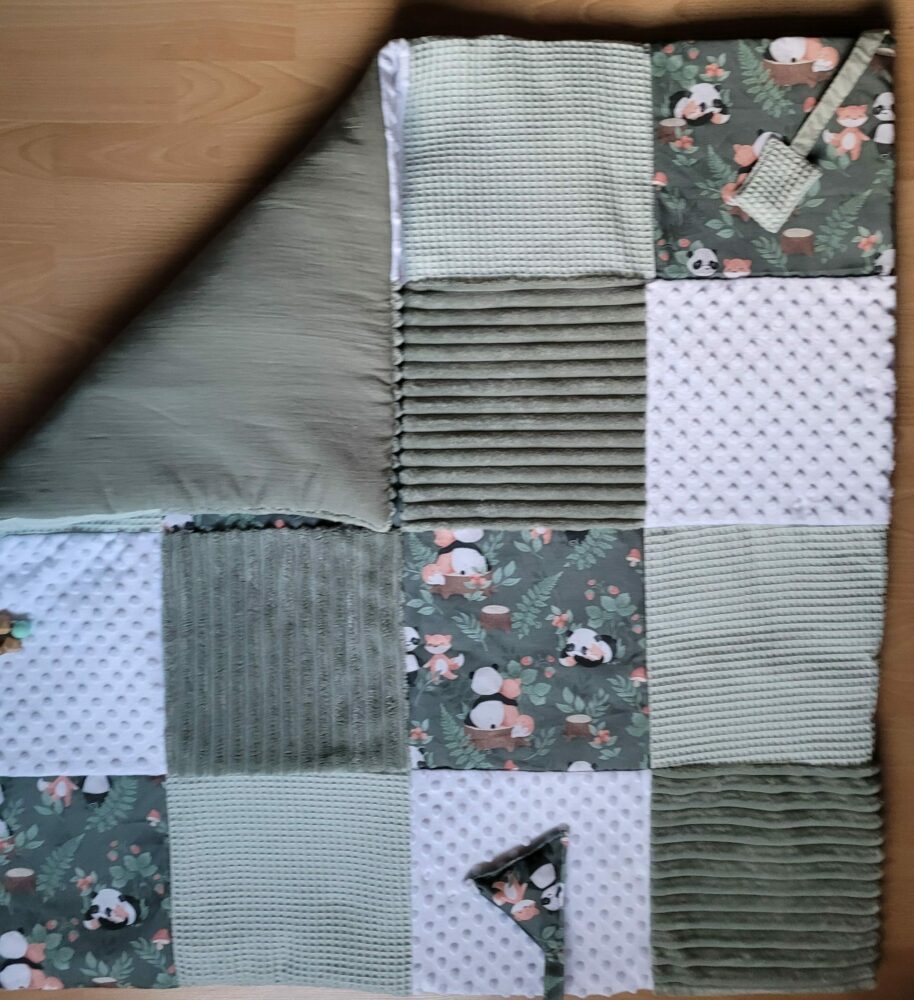 Tissus coton vert imprimé « pandas/renards », minky à reliefs blanc et à bandes vert, nid d’abeille vert d’eau, tissu gaze de coton vert pour le dessous, 2 couches de moelleton