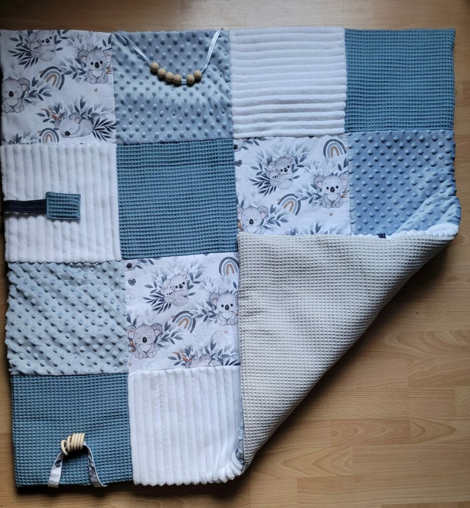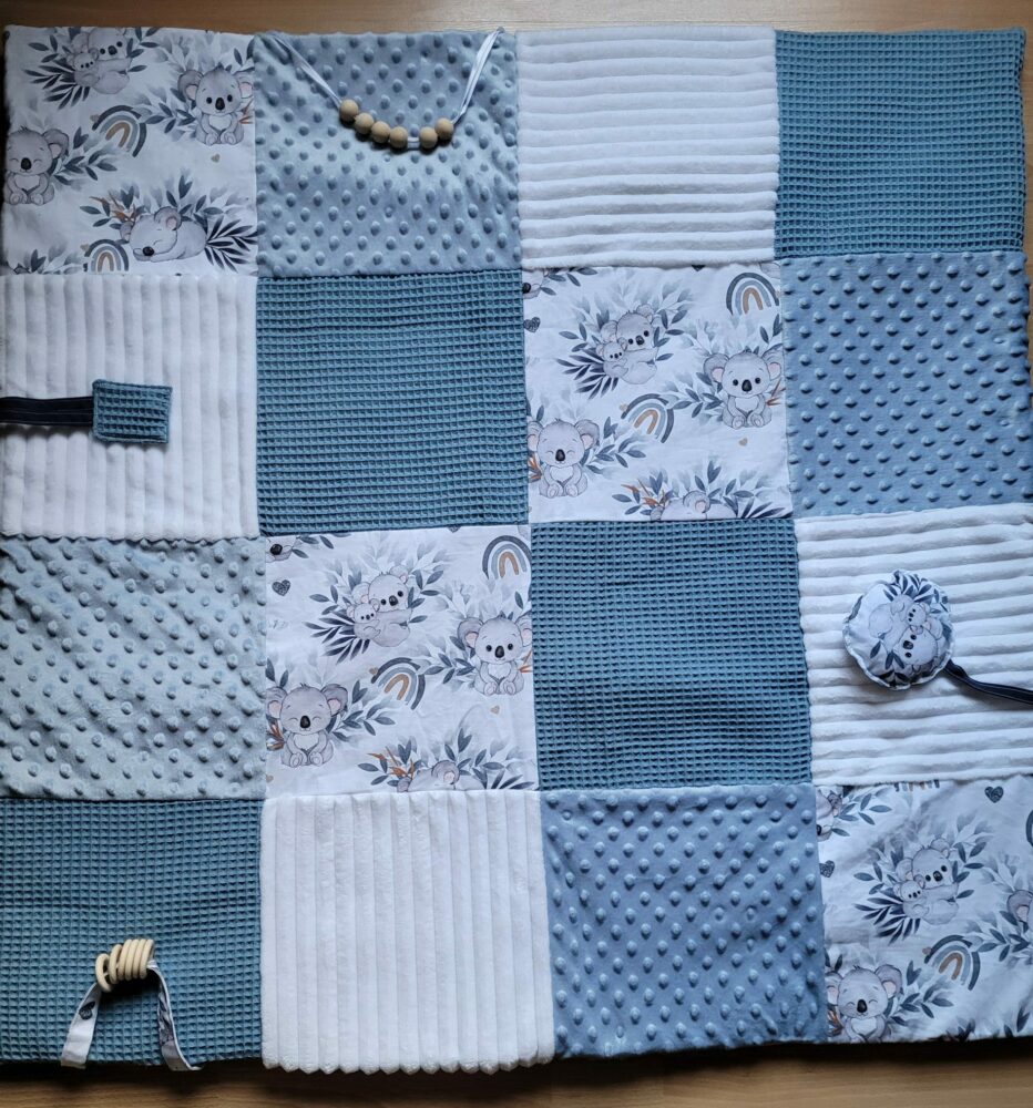 Tissus coton fond blanc imprimé « koalas », minky à reliefs bleu ciel et blanc à rayures, nid d’abeille bleu, nid d’abeille gris clair pour le dessous, 2 couches de moelleton