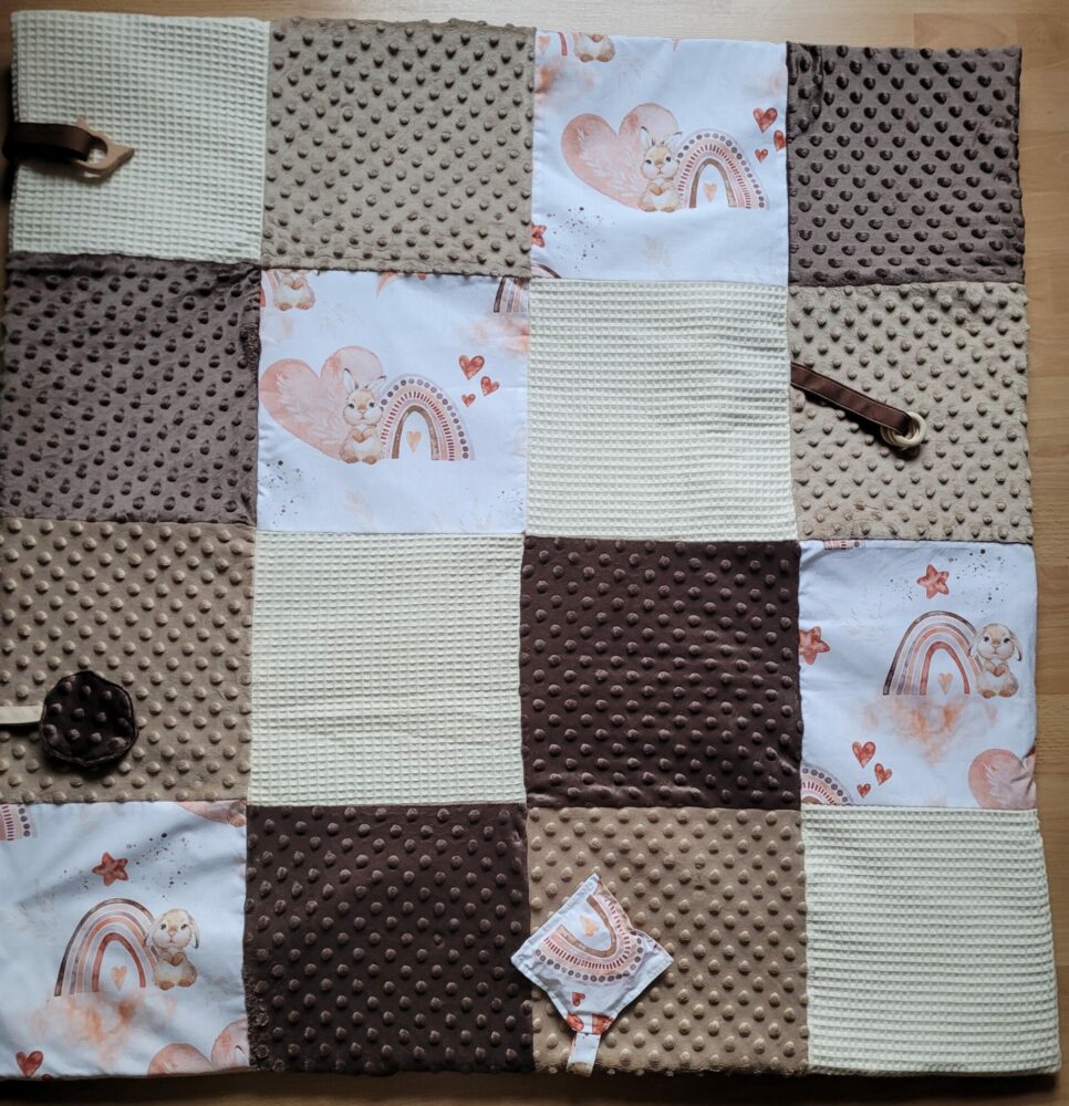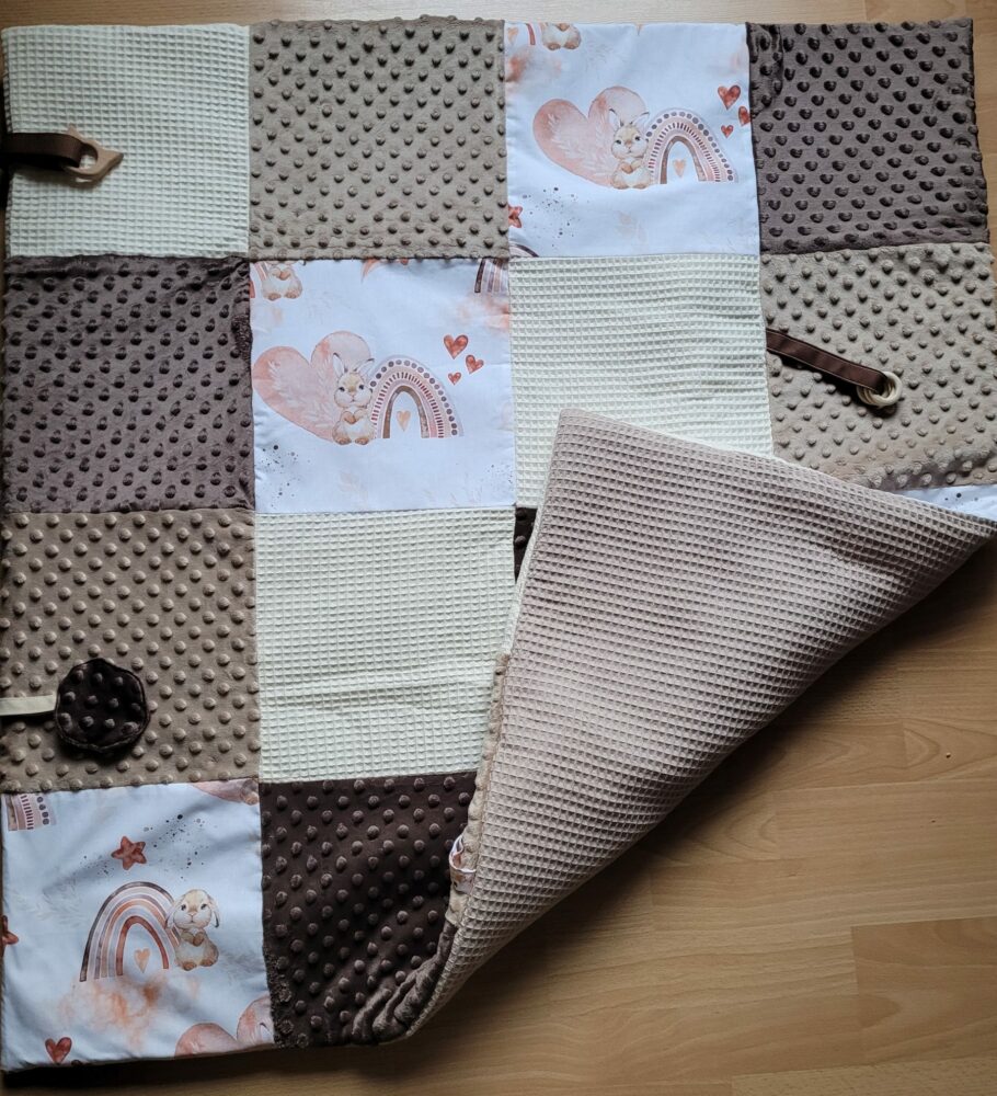 Tissus coton fond blanc imprimé « lapins », minky marron et beige, nid d’abeille écru, nid d’abeille châtaigne pour le dessous, 2 couche de moelleton